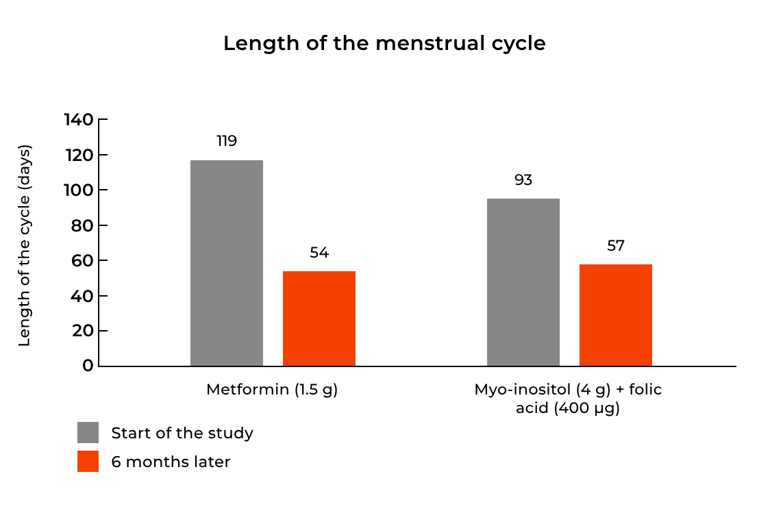 - Тривалість циклу скоротилася на 45% для метформіну та на 38,7% для інозитолу.