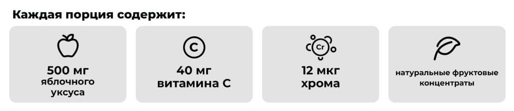 Яблочный уксус в порошке, витамин C (L-аскорбиновая кислота), пиколинат хрома, сахароза, глюкозный сироп, очищенная вода, загуститель (пектин), концентрат яблочного сока, концентрат гранатового сока, концентрат черной смородины, регулятор кислотности (цитрат натрия), концентрат морковного сока, натуральный ароматизатор, регулятор кислотности (лимонная кислота), глазирователи (кокосовое масло, карнаубский воск), концентрат черной моркови.