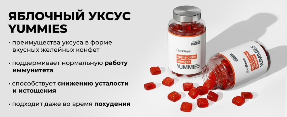 Яблочный уксус Yummies — это желейки с яблочным уксусом, витамином C и хромом, которые поддерживают обмен углеводов, белков и жиров.