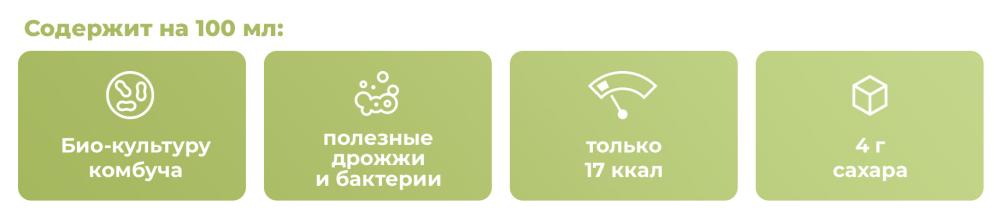 Вкус мята и лемонграсс: органическая ферментированная комбуча (вода, органический настой зеленого чая, органический сахар, органическая культура комбучи - дрожжи, уксус и молочнокислые бактерии), настой органической мяты и органического лемонграсса [вода, органический сахар, органическая мята (0,2%), органический лемонграсс (0,05%)], углекислый газ, ароматизатор лимона.