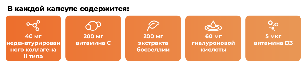 Витамин С (L-аскорбиновая кислота), экстракт индийского ладана (Boswellia serrata) (60% босвеллиевой кислоты), гиалуроновая кислота, неденатурированный коллаген II типа (из куриной грудины), наполнитель (микрокристаллическая целлюлоза), противослеживатель (стеарат магния), витамин D3 (холекальциферол), желатиновая капсула.