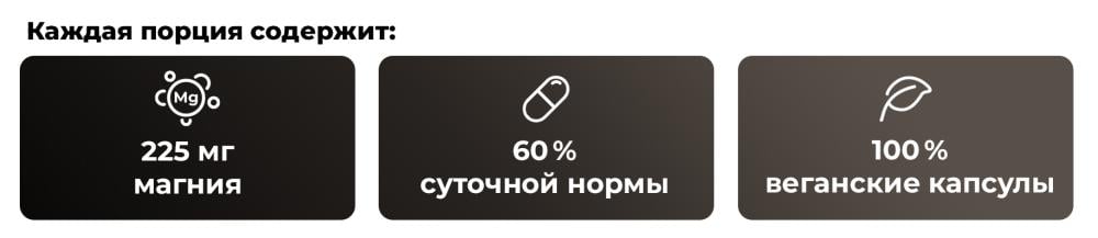 Поскольку продукт выпускается в форме удобных веганских капсул, вы можете легко включить его в свой ежедневный рацион. Суточная порция (3 капсулы) содержит 225 мг магния, что соответствует 60% рекомендуемой суточной нормы потребления и легко обеспечит более высокое потребление этого важного микроэлемента.