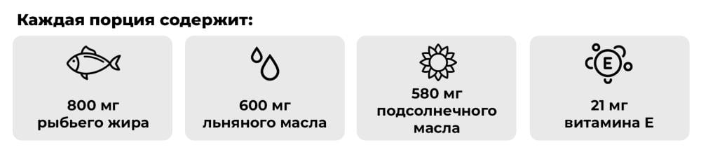 - содержит 800 мг рыбьего жира, 600 мг льняного и 580 мг подсолнечного масла