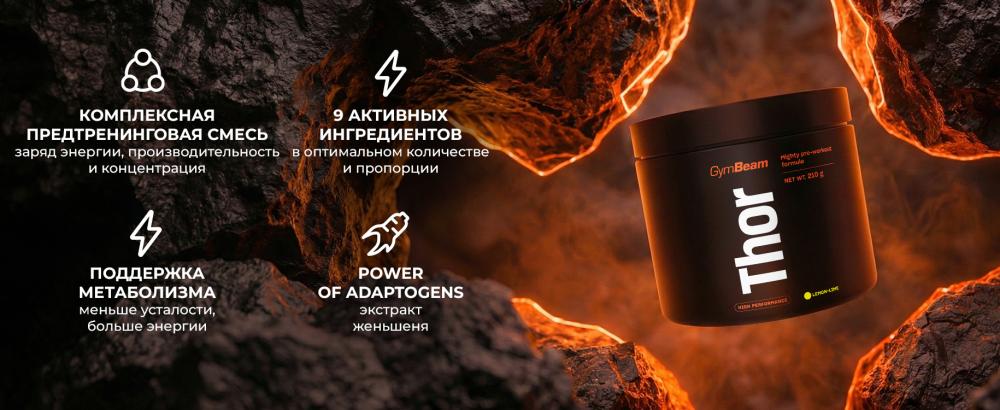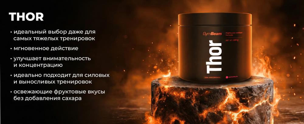 Thor — это уникальный предтренировочный комплекс, названный в честь бога грома. В его составе вы найдете, например, стимулятор кофеин, который при употреблении в дозе 3 мг/кг веса за час до тренировки способствует повышению выносливости. Кроме того, он повышает внимательность и улучшает концентрацию. Вместе с ним в составе комплекса содержится таурин, который часто входит в состав предтренировочных комплексов и энергетических напитков.