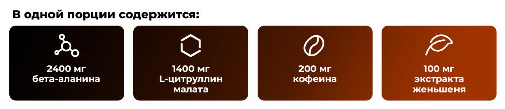 Вкус арбуз: бета-аланин, L-цитруллин DL-малат (2:1), L-аргинин альфа-кетоглутарат (A-AKG), декстроза, таурин, моностеарат глицерина, антислеживатель (диоксид кремния), безводный кофеин, ароматизатор, порошок свеклы, антислеживающий агент (фосфат кальция), регулятор кислотности (лимонная кислота), экстракт сибирского женьшеня 10:1 (корень) (Eleutherococcus senticosus), подсластитель (сукралоза), ниацин (никотинамид), экстракт горького апельсина 40: 1 (плод) (Citrus aurantium) (80% синефрин).