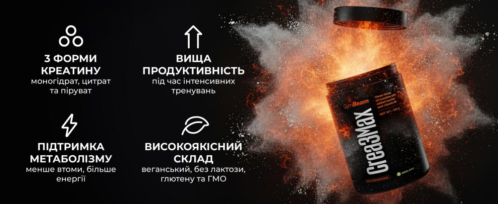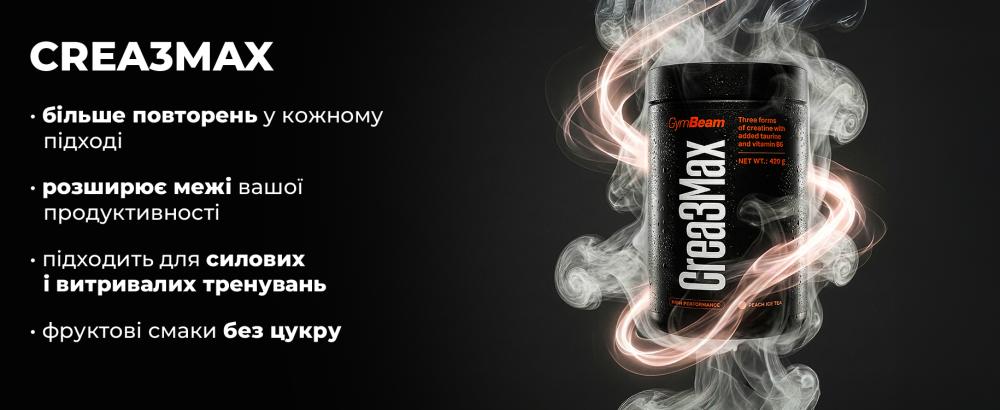 Crea3Max – це унікальна багатокомпонентна суміш, яка поєднує три види креатину. Вона створена для спортсменів, які хочуть отримати максимум від своїх тренувань. Креатин є одним з найбільш досліджених спортивних добавок. Він зберігається в організмі у формі креатинфосфату, який організм використовує як джерело енергії (АТФ). У результаті, при споживанні 3 г на день, він підвищує фізичну продуктивність під час коротких послідовних інтервалів інтенсивних тренувань. Це відіграє ключову роль під час динамічних і силових вправ.
