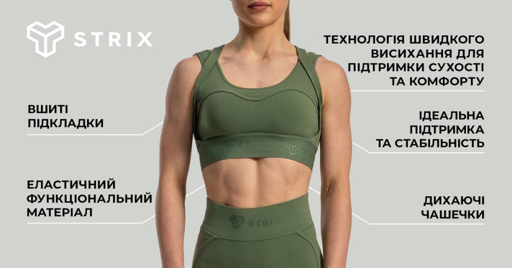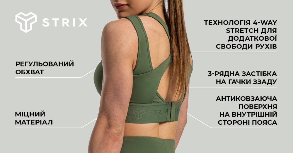 Бюстгальтер також привертає увагу з першого погляду своєю оригінальною посадкою. Дизайнерська форма спинки поєднується з класичними бретелями, що надає йому неповторного вигляду, який вражаюче виділить вас серед інших. Завдяки стильному логотипу Strix на ремінці та спинці ви зможете показати всім свою мотивацію до спорту та фізичних вправ.