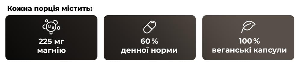 Оскільки продукт випускається у формі зручних веганських капсул, ви можете легко включити його у свій щоденний раціон. Добова порція (3 капсули) містить 225 мг магнію, що відповідає 60% рекомендованої добової норми споживання і легко забезпечить більш високе споживання цього важливого мікроелемента.