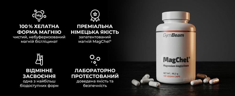 MagChel® - бісгліцинат магнію - це високотехнологічна добавка магнію у високоякісній хелатній формі, а саме 100% чистий небуферований бісгліцинат магнію. У цій органічній формі магній зв'язаний з двома молекулами амінокислоти гліцину. Це ключове зв'язування гарантує його ефективність, стабільність і хорошу біодоступність. MagChel® є зареєстрованою торговою маркою німецької компанії MAGNESIA, яка має давні традиції преміальної якості і є одним з європейських лідерів у розробці функціональних мінералів та сировини для харчових добавок.