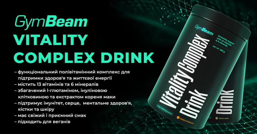 Напій Vitality Complex — це комплексний вітамінний порошок для підтримки здоров'я та життєвого тонусу щодня. Він містить різноманітну суміш ретельно підібраних активних інгредієнтів, зокрема 13 вітамінів і 6 мінералів. Це сприяє засвоєнню необхідних мікроелементів, які беруть участь у важливих процесах організму. Для комплексності склад збагачений клітковиною інуліном, глютаміном та екстрактом кореня маки.